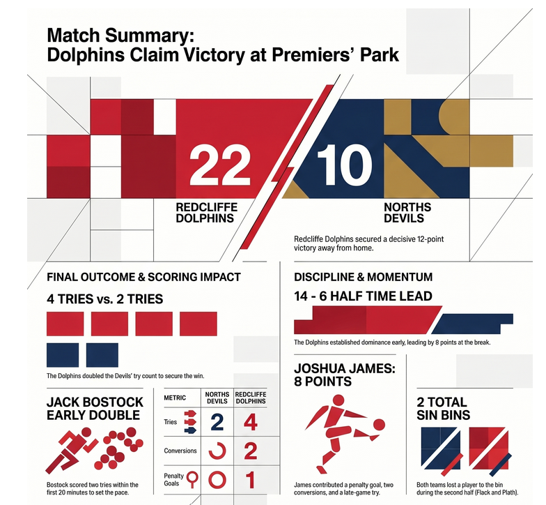 In Round 7 of the 2026 QRL Hostplus Cup at Premiers’ Park, the Dolphins rode a sharp opening burst and composed finish to defeat the Norths Devils 22–10 in a contest that stayed alive far longer than the scoreline suggests.